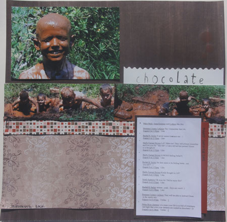 Chocolate or Facebook I couldn't decide what to title this one? One day I posted the 4 x 6 photo on Facebook with the status "This is my life!" and then I got lots of comments - some of them cracked me up. So, I when I saw this photo again as I was trying to decide what photos to scrap, I knew I had to print these. I also have quite a few other mud layouts...cause my boys love to play in the mud. The main journaling for this layout is the comments from that Facebook post. I copied and pasted them into a word processor and then re-sized them to fit the space that I wanted. I will probably add my own journaling/story to the back of this layout. Sometimes I just can't find a way to put it on the layout itself and fit it into the design. I used brown patterned paper for the background from Cloud 9 Designs Specialty Paper Pad Glitter Papers. The flourish patterned paper is also from the same pack. The ribbon running horizontally along the bottom of the small photos is from American Crafts Elements - not sure which color pallet? I also used a stamp right above the title. It is circles and I used my red pigment ink pad. It turned out pretty subtle but I like the extra touch of red.