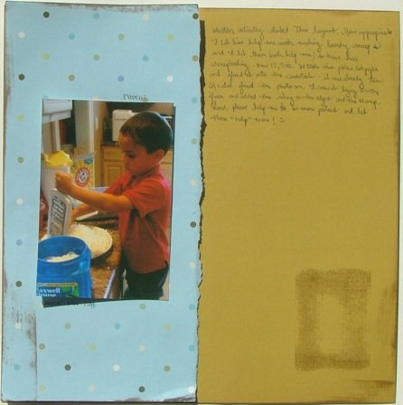 I am very bad about letting my kids help me with things...it is the perfectionist/impatient part of me...Lord, help me. But this time, I let W play with some papers and gave him a little bit of guidance and the layout below is what happened. He took the polka dot paper from my scrap paper drawer. I believe it had already been torn. He was going to make that the layout but I helped him realize he needed a 12 x 12 background. So he attached the polka dot to the solid background. I added the watermark stamp, the distressing around the edge and the photo.