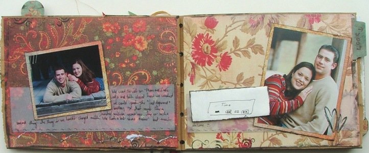 I used very similar techniques from the last pages. The fun thing about this one was the little drawing from our courting days that I added to the right page. The other different thing is on the left page. I used 2 layers of paper for the bottom layer. I tore the bottom edge of the top one and then laid it on top just to give some interest.