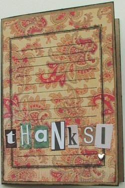 I used one of the patterned paper from the Daisy D's Attic Heirlooms paper pack...the same one I used for the paper bag album. I stamped it with the journaling block stamp and the used letter stickers that came with the paper pack to spell out the word "Thanks!" For the bottom of the exclamation point, I used a heart shaped brad. For the finishing touch, I inked around the edges.