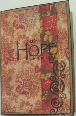 This was super simple...just a background paper and then a coordinating vertical paper strip, the stamped greeting and the vertical stamped swirl. Finally, I inked around the edges. The greeting stamp is Stampabilities HOPE ER1027.