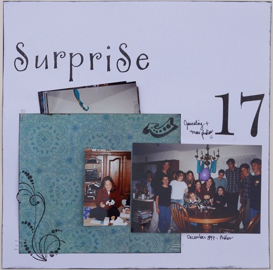More old photos...it's fun to go "way back" and scrapbook photos of my teenage years. It seems like "forever" since then. I texted my sister a pic of this layout and she said she barely remembered the event...my 17th surprise birthday party...can you believe that? She didn't remember my 17th birthday? : ) This was super simple to do and I used my favorite pocket technique so I could fit a lot of photos onto 1 12x12 layout. I used a plain piece of white card stock for the back ground and then used the teal pattern for the pocket. I attached it with staples. Then I attached the photos and added the flourish stamp and the arrow stamp. The title and the big 17 are cling stamps I got at Michael's - not sure what they are exactly...they're not in the original package.