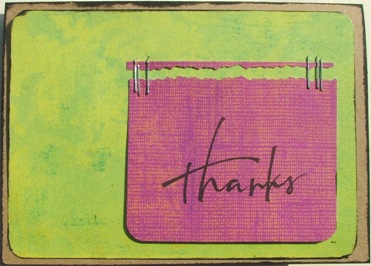 This one was fun...I love the lime green and pink color combo. I also used the corner rounder. I started with the lime green back ground and then used the pink to stamp the greeting on. I cut a small strip off the pink with my decal edge scissors and then attached both pieces a little bit apart with the stapler.