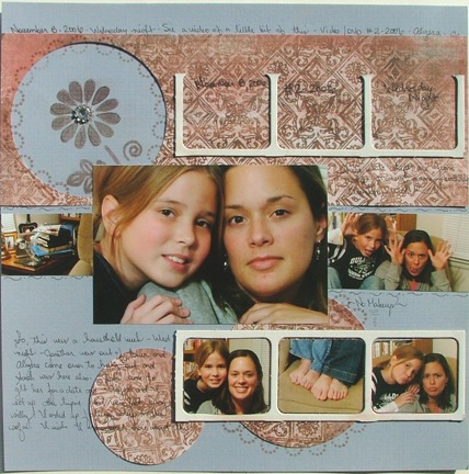 This month's ezine sort of snuck up on me so I was happy to find this layout tucked away in one of my scrapbooks. I was doing a bit of cleaning up and out...yeah! The white grids are from my son's Memory game. They are the pieces leftover from punching out the cards. So, I started out with the grey-blue card stock. Then I cut out the large circle from the pink pattern and put it on top. I then added the 4 x 6 photo and the smaller photos on either side. I placed one of the pink pattern circles under the 4 x 6 photo and the smaller one to the left of it. Then I added the white "filmstrip" pieces from the Memory game. Finally I added the stamp detailing and the hand journaling. Oh yeah, and the bling in the middle of the flower. : )