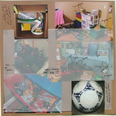 On the right side I added the photos of their toys at this stage. They have a corner of the den with plastic drawers for their inside toys and a corner of the garage for their outside toys. I went around one evening snapping photos just for this layout. I decided to place vellum over the pics of the toys because there were too many competing colors and patterns and the vellum muted them out a bit.
