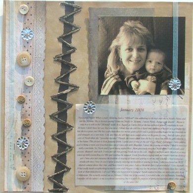 Heritage inspired layout...this is Noah and Nana. This page took me longer than usual because I actually used a needle and fibers to stitch the two tan pieces of faux suede paper together. I placed a brown piece of card stock behind where faux suede paper is stitched together. I used a pattern piece that had lace, musical notes and polka dots for the other elements on the page. I cut along the edge of the lace and separated the paper and placed one strip down the left side and two of the other pieces on the right side under the photo and vellum. I then added the two ribbon strips – one on each side and then buttons. Then I printed out my journaling on vellum and attached it and finally placed the final button and clear flower embellishment.