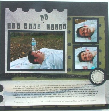 Oh, my crazy husband! That is the inspiration behind this layout idea. We were at the park hanging out and he does that bottle trick you see in the photo. I caught it on camera and this layout was born. The title is You Make Me Laugh. I hadn't planned to make the ME stand out on the line above but I forgot to include it when I was stamping so I added it and I like the way it turned out. The background for this design is black card stock. The placement of the photos and a few other things were inspired from a layout in Creating Keepsakes – my personal favorite scrapbooking magazine! I then personalized it for this layout. After the black card stock cam the green and black polka dot paper. The next layer is the tan pattern paper that the title is stamped on and the strip along the bottom under the vellum. Then the matted photos came next. I had 3 or four similar photos and I didn't want to put 3 or 4 4x6's on the same layout so I cropped just his face to get the silly effect. Before I attached the tan pattern paper I punched out half circles just for interest. I printed out my journaling on vellum and attached it and then place the black ribbon above it and put the circle stamp matted on black card stock as the final accent.