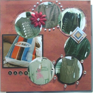 This layout was inspired by my wardrobe. I was a fairly new SAHM and I had a closer full of dressy/career clothes so I took a shopping trip. This is what came of that shopping trip. In some ways looking back it seems to be silly to do a layout all about clothes but it is the REAL stuff of life – something that I was inspired to scrap by Ali Edwards. I always like her real layouts! I did something a bit different on this one. Instead of using one 12 x 12 sheet for the background I used two. I cut them each down just a little bit and then offset them. I then matted the Old Navy photo and cut out each of the clothing photos with my Fiskars circle cutter. I matted two of the circles – one with a patterned piece and one with black and then punched out little half circles around the edges. I added a few embellishments and stickers for the title and then the journaling is on the back. I copied a few pages out of my real journal and attached them to the back.