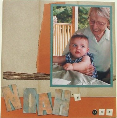 I love this one because my grandmother is smiling...she mostly just “looks pleasant” in most photos. This is her and my 1st born...so sweet! The background is 2 different papers...the burnt orange card stock and the “paneling print”...sort of barnyard looking. Next, I took the same orange card stock and tore a bit of it and placed it behind the matted 5 x 7 photo. Also behind the photo is the corn shuck “stuff” I mentioned earlier. I think it is actually the “rope” stuff that you can get at craft stores and then unroll to make a corn husk looking material. I like the visual interest it gives. I'm not sure if it is acid free but I like the way it looks. For the title, I used 2 different style stickers and the large letters are from a patterned paper sheet...I just cut out the letters I needed.